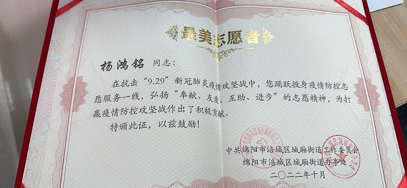 在志愿服务期间,他主要负责疫情数据的摸排,统计基本信息,提醒风险人员做核酸,并按照规定对中高风险地区入绵的人员进行隔离等工作。杨鸿铭表示,虽然工作内容繁琐且量大,也仍然坚持“为社区人民守好一道安全防疫线”的原则,做到不漏一人、精准防控,希望在大家的共同努力下能早日战胜疫情。
