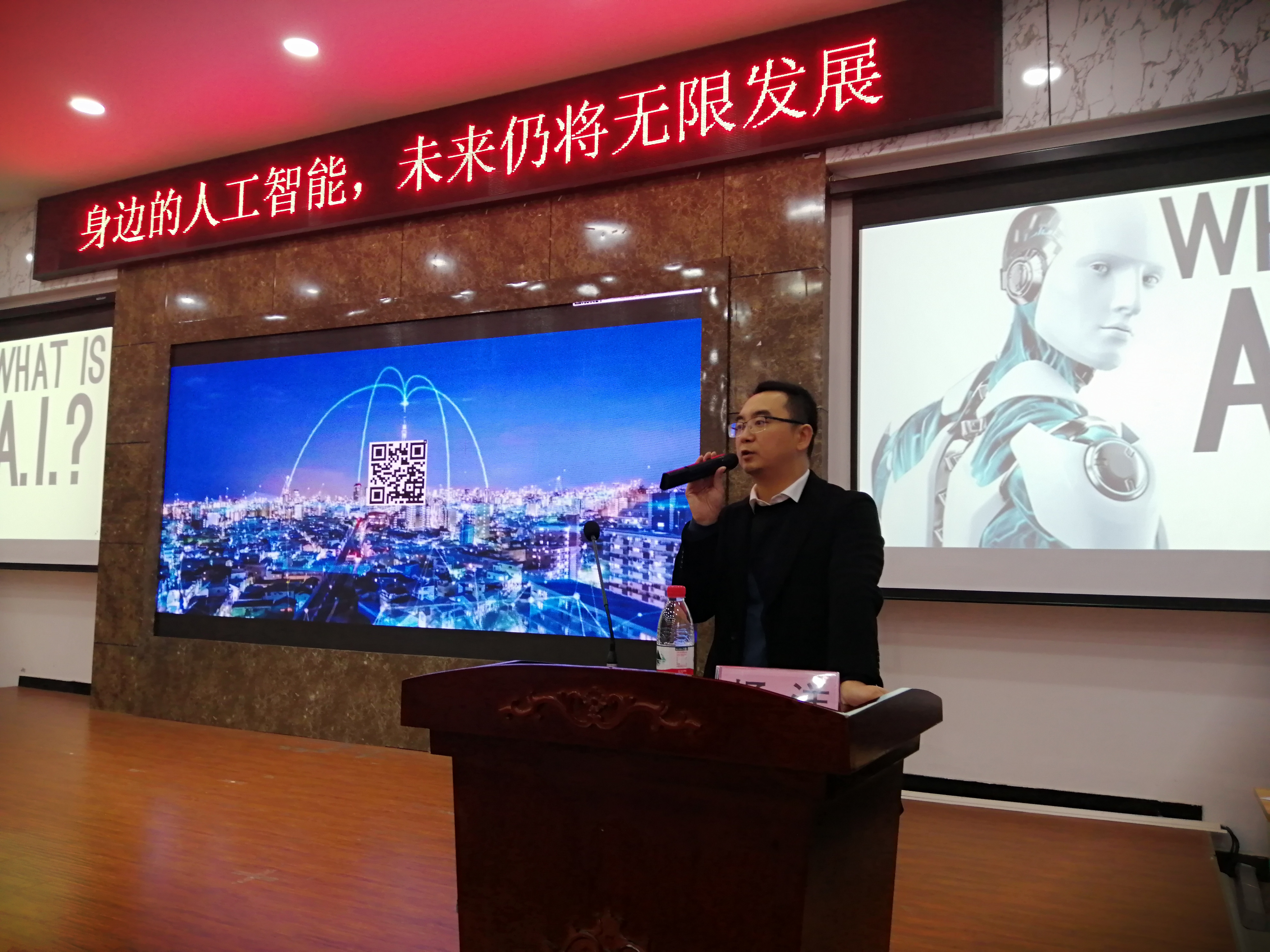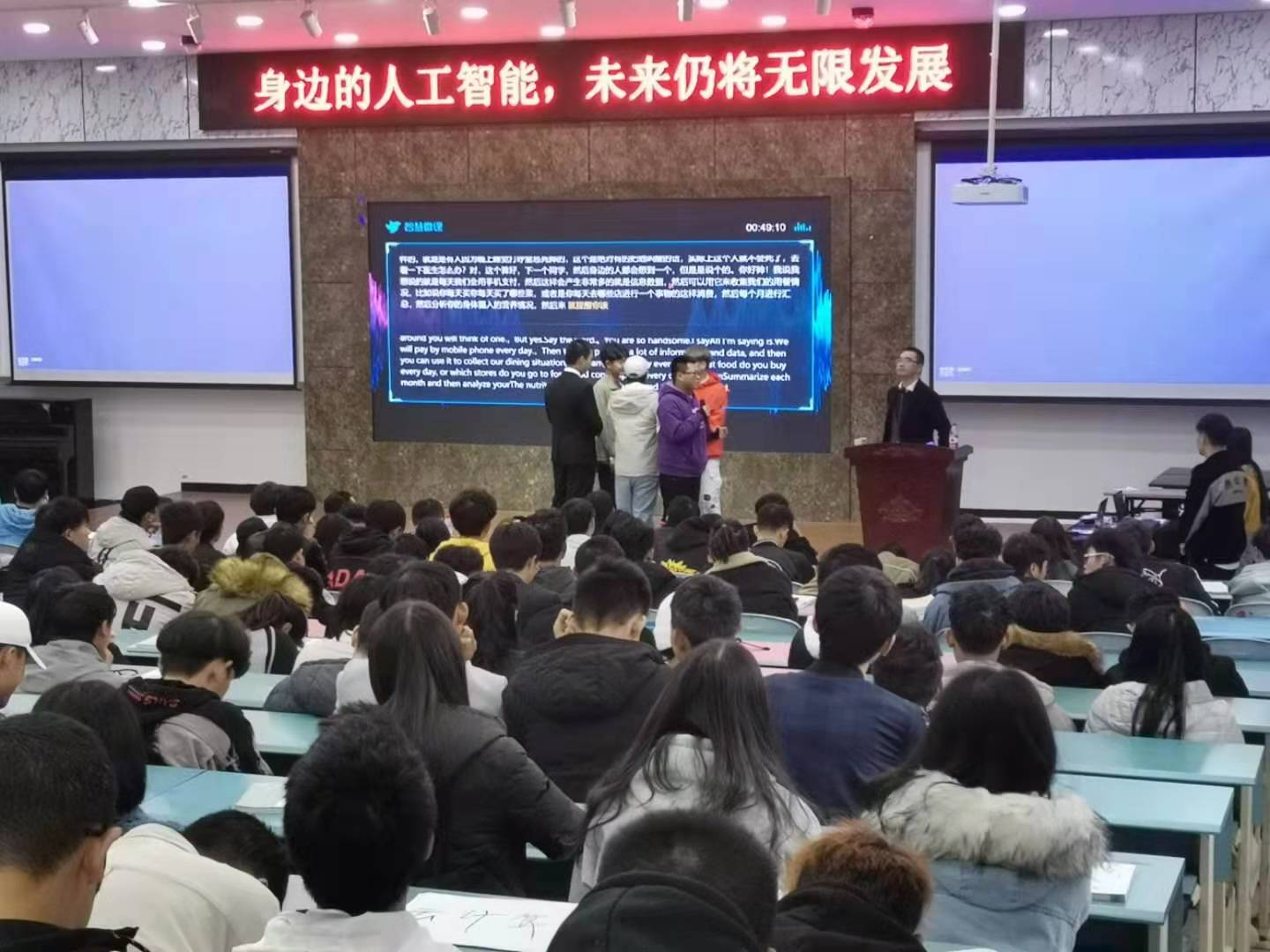 杨洋在讲座中通过生动的例子为大家进行了深入浅出的讲解,让同学们对人工智能有初步认识;同时杨洋老师结合亲身经历来说明人工智能在各个领域的运用以及人工智能所带来的便利;现场还使用科大讯飞语音转换器展现出它的超高识别率,让同学们更加深入的了解到人工智能的强大。同学们表示从本次讲座中对人工智能有了更深入的认知,对人工智能创造未来有无限的憧憬,对专业知识学习的积极性有了很大提高。